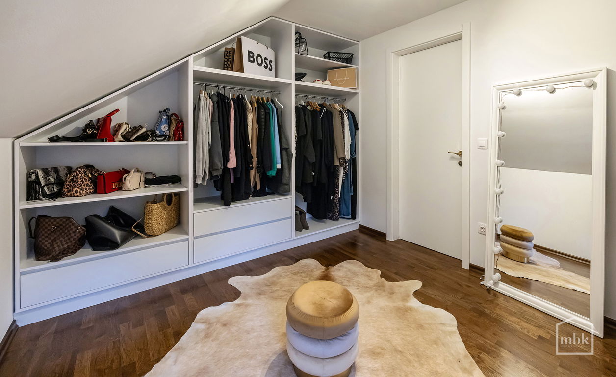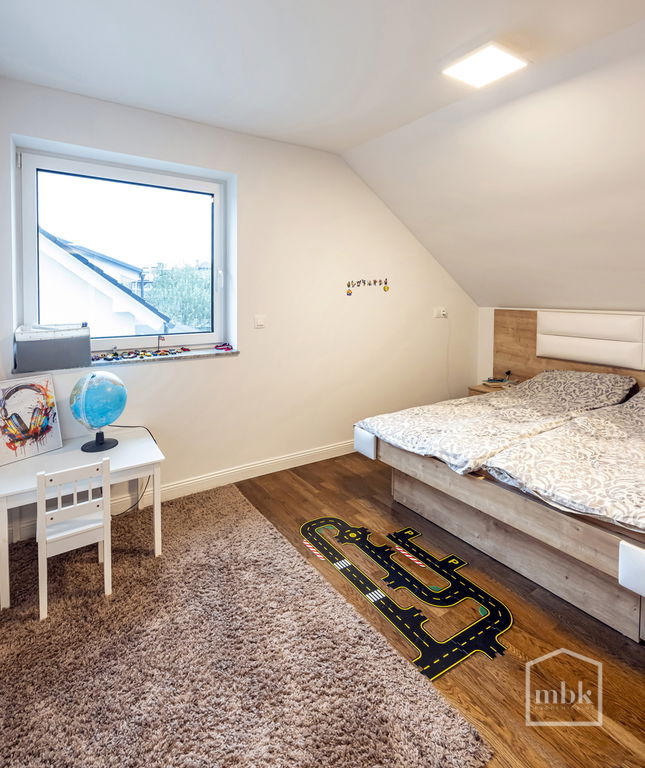 MANSARDA: prostorna spalnica za starše, tri otroške sobe, kopalnica z banjo