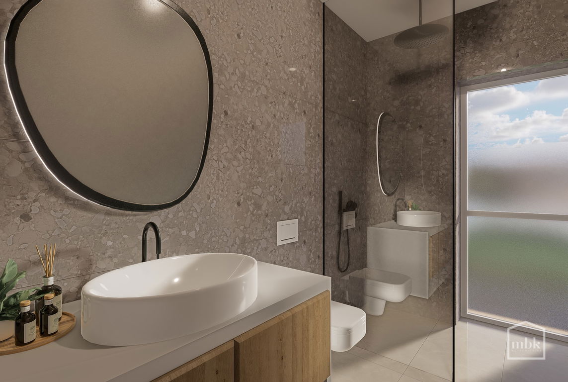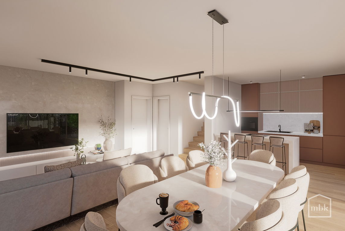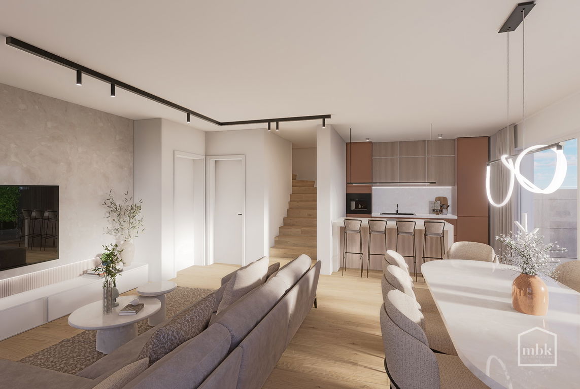 - PRITLIČJE: osrednji bivalni prostor (kuhinja, jedilnica, dnevna soba z izhodom na teraso in ozelenjen atrij), tehnični prostor, dnevni wc, utility, vetrolov